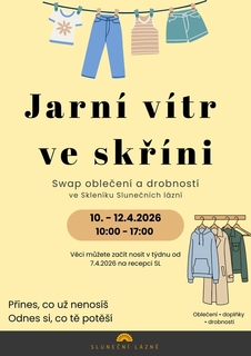 Ve skleníku Slunečních lázní proběhne přátelský swap oblečení a drobností. Přineste věci, které už nenosíte nebo nepoužíváte, ale mohou ještě udělat radost někomu dalšímu. Na oplátku si můžete vybrat něco nového pro sebe.