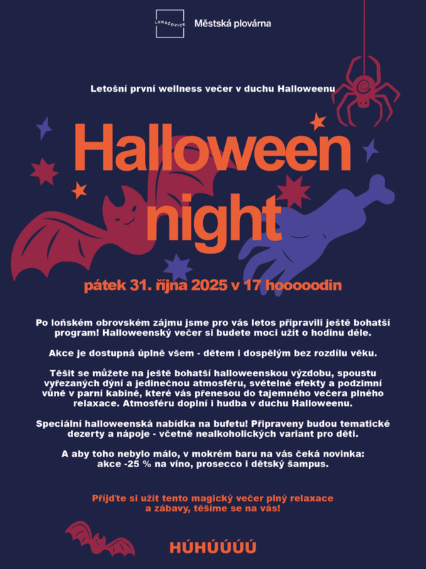 Po loňském obrovském zájmu jsme pro vás letos připravili ještě bohatší program! Halloweenský wellness večer se bude konat v pátek 31. října 2025 od 17:00 do 22:00, takže si magickou atmosféru budete moci užít o hodinu déle než obvykle. Těšíme se na Vás!