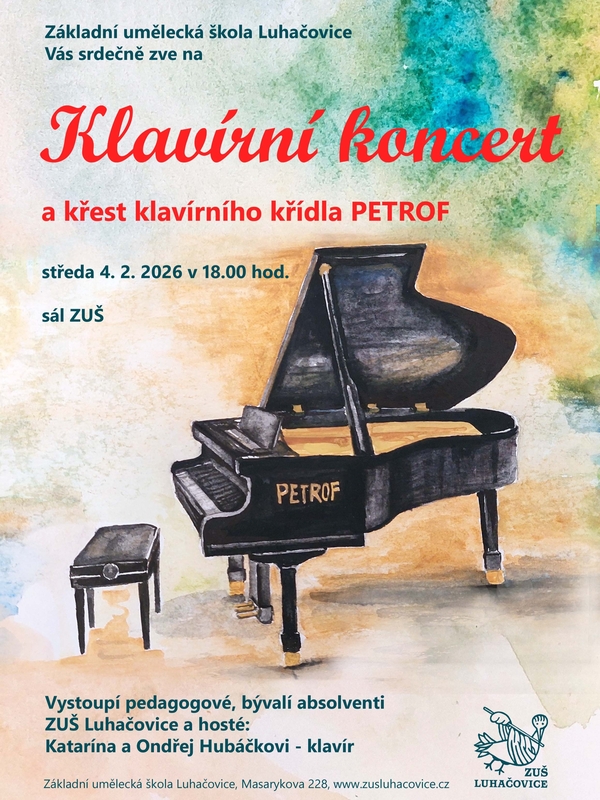 Srdečně Vás zveme na slavnostní klavírní koncert spojený s křtem nového klavírního křídla PETROF, které škola získala díky mimořádné finanční podpoře zřizovatele Zlínského kraje.