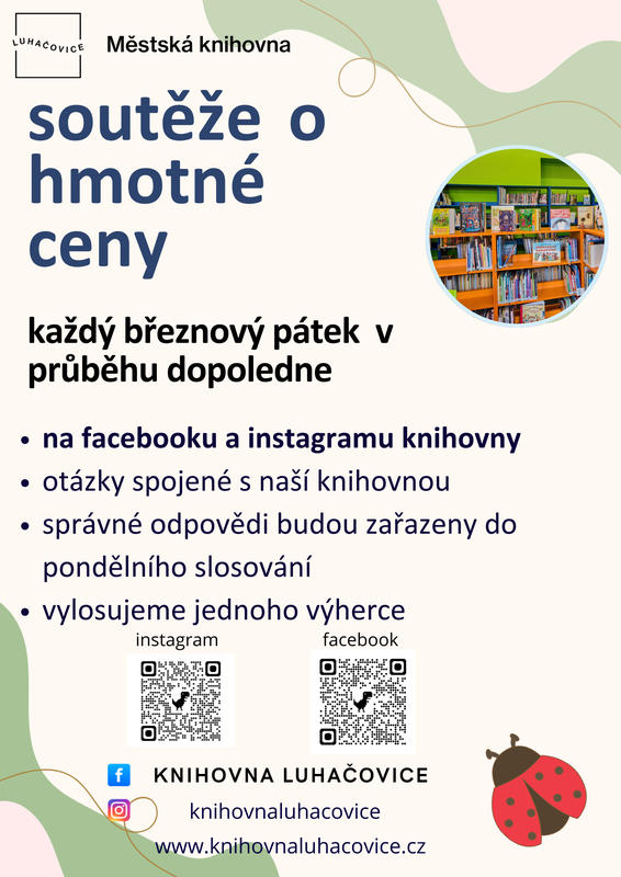 Každý BŘEZNOVÝ PÁTEK se můžete těšit na SOUTĚŽE O HMOTNÉ CENY. Soutěžní otázky, týkající se naší knihovny, budou zveřejňovány během DOPOLEDNE na facebooku KNIHOVNA LUHACOVICE a instagramu knihovnaluhacovice. Správné odpovědi budou zařazeny do pondělního slosování, kdy bude vylosován jeden výherce.